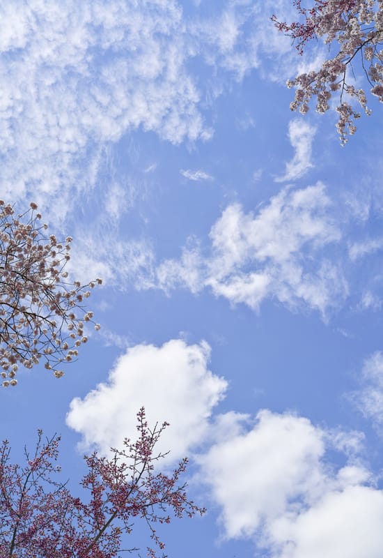 Layered Clouds, Spring Blossoms and Foliage