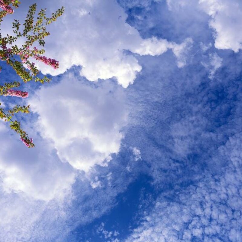 Sky Factory Virtual SkyCeiling Master Image 6es Featuring Layered Clouds and Blossoming Spring Trees.