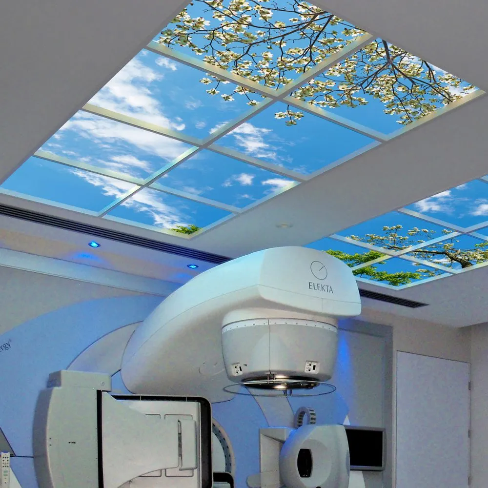 The overhead skylights create the vivid illusion of perceived proximity to a clear blue sky, which engages the imagination and memories of the patient of pleasant days outdoors while they undergo their treatment.